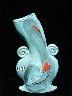 Janice Cook’s pots have traveled places she would love to go, to Japan and Guinea Bissau, the Ukraine, New Zealand and parts in between. She has been a full time potter for fifty years with studios in Amherst, Massachusetts and Tempe, Arizona, before settling in southern New Mexico in 1980. She works in porcelain enjoying the choreography of her shapes and the dazzling colors of the slips and stains she uses to decorate.